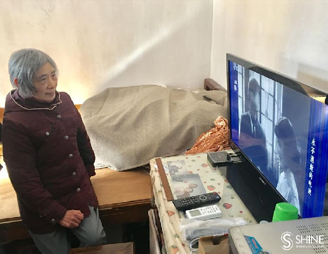 Zhou Juexin, who lives alone in Hongkou District, watches television after an intelligent chip was installed on her electricity meter.