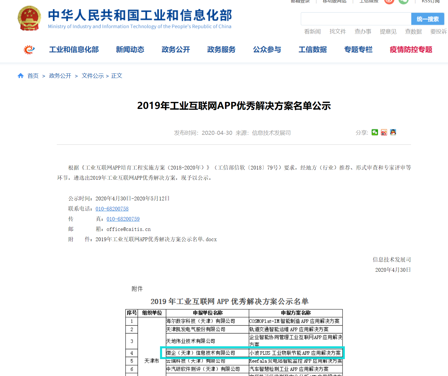 2020年5月,微企信息全資子公司微企(天津)信息技術有限公司的“小波Plus工業物聯節能平臺”入選中華人民共和國工業和信息化部的“2019年工業互聯網APP優秀解決方案”。