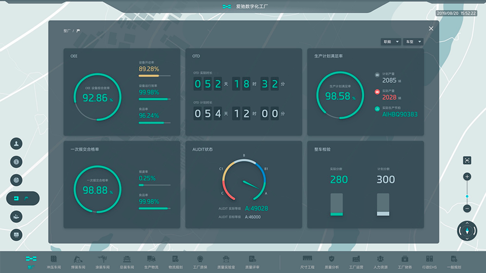 通過對于人機料法環測等要素的監控,以生產單元為基礎監控車間的產品生產過程情況。依靠庫房管理、物流配送系統。實現對于物料入庫、出庫、配送等過程的還原及監控。依靠MES、質量、人力、考勤(qin)等(deng)系(xi)統,實現(xian)對(dui)于(yu)人員所處位置、人員實時(shi)分布(bu)、工(gong)作情況(kuang)的監(jian)(jian)控(kong)和(he)分析(xi)。依(yi)靠設備(bei)(bei)管(guan)理、工(gong)裝工(gong)具管(guan)理等(deng)系(xi)統,以(yi)及數(shu)控(kong)設備(bei)(bei)、測量設備(bei)(bei)集成,實現(xian)對(dui)于(yu)設備(bei)(bei)位置信(xin)息、運行狀態、維保(bao)等(deng)信(xin)息的監(jian)(jian)控(kong)。依(yi)靠視屏監(jian)(jian)控(kong)、安(an)全帽識別、設備(bei)(bei)管(guan)理等(deng)系(xi)統或(huo)設備(bei)(bei)接口集成,實現(xian)對(dui)于(yu)生產(chan)安(an)全的實時(shi)監(jian)(jian)控(kong)。