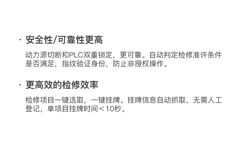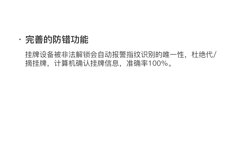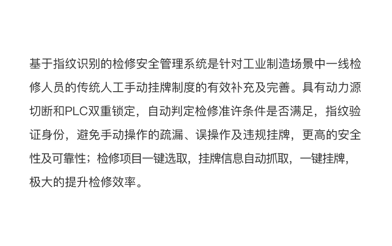 基于指(zhi)紋識別(bie)的(de)檢修安(an)全管(guan)理系統是針(zhen)對工業(ye)制造場景中一線檢修人(ren)員的(de)傳(chuan)統人(ren)工手動(dong)掛(gua)牌制度的(de)有效補(bu)充及完(wan)善。它在安(an)全性、效率、防錯(cuo)能(neng)力方面(mian)取(qu)得(de)大幅度優(you)化的(de)成績。