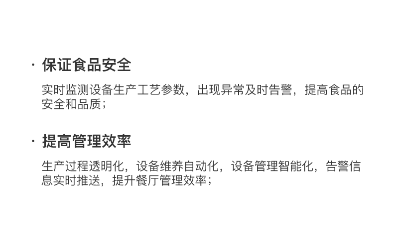 智慧餐廳管理系統基于物聯網平臺架構,結合邊緣計算、無線傳感、RFID、OCR識別、機器視覺、UWB、LoRa等多(duo)種(zhong)技術,實現采購、物流、倉儲、生產(chan)、銷售各環節的信息化、數字化管理,降(jiang)本增效(xiao),提高(gao)產(chan)品質(zhi)量,優化客(ke)戶體驗,助力企業流程(cheng)標準化,加大連鎖化擴張的進程(cheng)。