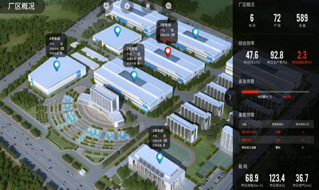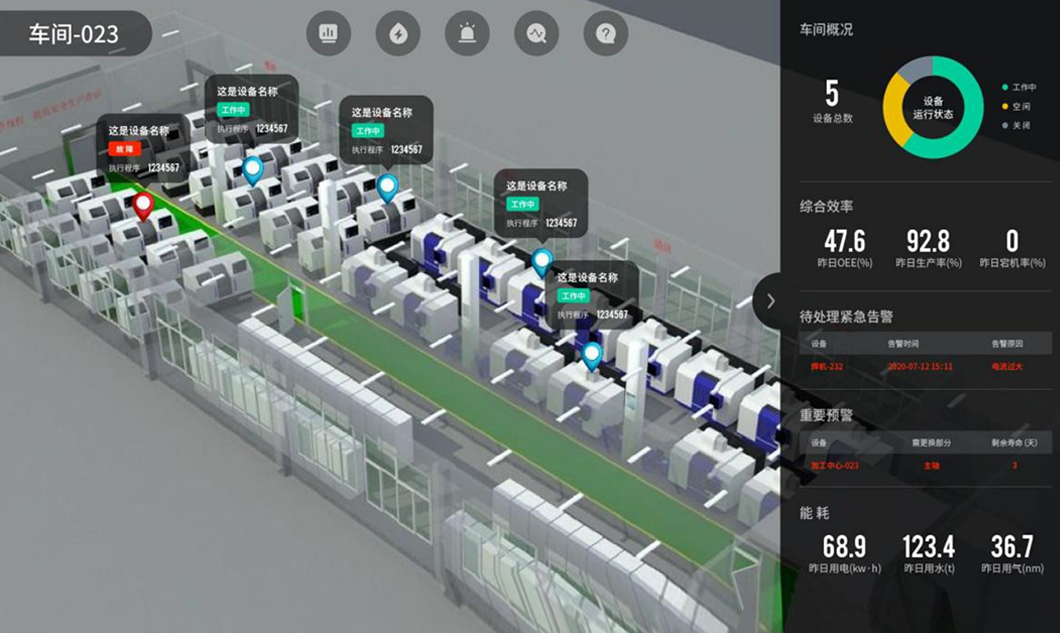 聚焦于打造智慧工廠運營平臺,將工廠關注四大點:生產、質量、設備、安防實時的展現在運營平臺上,該界面通過前端3D技術與平臺的數字孿生體技術相融合,支持狀態的實時自動更新,方便用戶進行設備監控管理。實時反映工廠生產區域實際狀態,真實還原生產流程,從產品-設備-人員的全流程監控。
